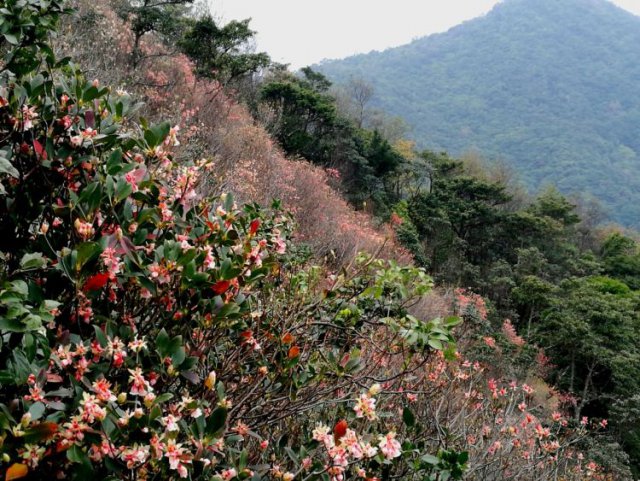 登上梧桐山,遠(yuǎn)看,這片山林如秋日層林盡染,層層綠障中帶著紅邊。吊鐘花自然分布在海撥400m以上山體,主要小梧桐到大梧桐山頂坡面,尤其山脊線兩側(cè)較多。近兩年加強了撫育,現(xiàn)在,小梧桐杜鵑谷(10畝)、葫蘆徑至疊翠亭(30畝)、大梧桐頂(20畝)吊鐘花開花情況較好,都能賞吊鐘。吊鐘較長的花梗下垂懸掛著形如鈴鐺的花朵,其獨特的花形也讓吊鐘有了鈴兒花、倒掛金鐘、燈籠花等別稱。吊鐘是一種落葉或半常綠灌木,樹不高,通常3米左右。