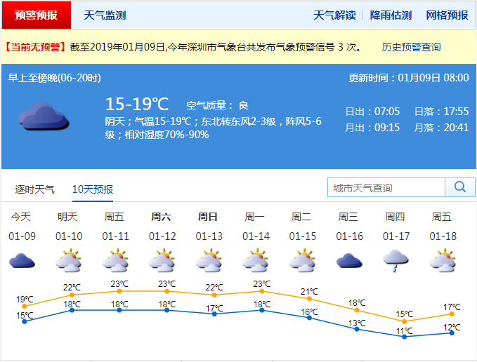 深圳新聞網(wǎng)2019年1月9日訊(記者 陳婕)先帶來兩個好消息,首先是本周末陰沉天氣好轉(zhuǎn),有明顯陽光,適宜出行游玩浪起來!第二個好消息就是春節(jié)期間(2月4日-2月10日),無強冷空氣影響深圳市。假期前期溫暖舒適,后期弱冷空氣影響,氣溫略降,最低氣溫12-13℃。目前大片云層覆蓋了我國華南地區(qū),深圳市天氣陰沉,缺少陽光,明后天還是持續(xù)陰天,有分散小雨,衣服曬不干。