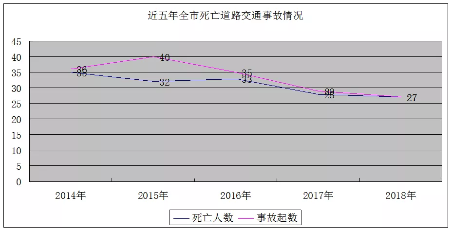 2014年至2018年春運,近五年的春運期間我市共發(fā)生死亡道路交通事故156起、死亡168人。其中,2014年發(fā)生35起,2015年32起,2016年33起,2017年28起,2018年27起,呈逐年平穩(wěn)下降趨勢。