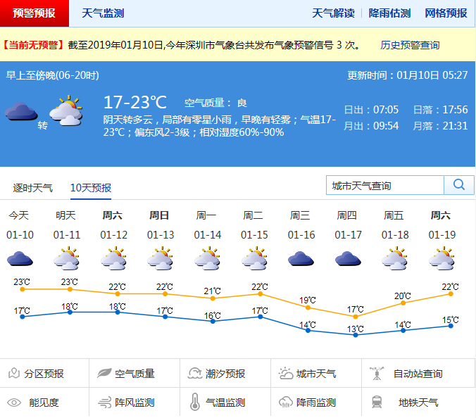 綜合海氣環(huán)流分析和歷史氣候背景,市氣象局預(yù)計(jì)深圳的1月將是“氣溫起伏大、階段性陰冷、降雨少而弱”的特點(diǎn)。分別在15-17日、24-25日、1月底至2月初會(huì)有冷空氣影響,伴小雨或分散小雨,沿海和高地陣風(fēng)7-8級(jí),且月內(nèi)最低氣溫10℃以下會(huì)有三天左右。而在冷空氣間歇期,則受暖濕南風(fēng)影響,空氣濕度加大,易出現(xiàn)霧和輕微回南天。未來幾日多云間陰天,陽光增多,早晚有輕霧,天氣溫暖,早晚較濕潤;15日起冷空氣影響,氣溫小幅下降。