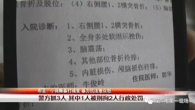 記者從中海醫(yī)院了解到,被打城管隊員徐濤右側(cè)腰兩橫突骨折。龍崗警方發(fā)通報,鑒定徐濤為輕傷,以涉嫌故意傷害罪,對光頭男子趙某青采取刑事強制措施,同時對其妻李某玉和女老鄉(xiāng)王某,以毆打他人處以行政處罰。