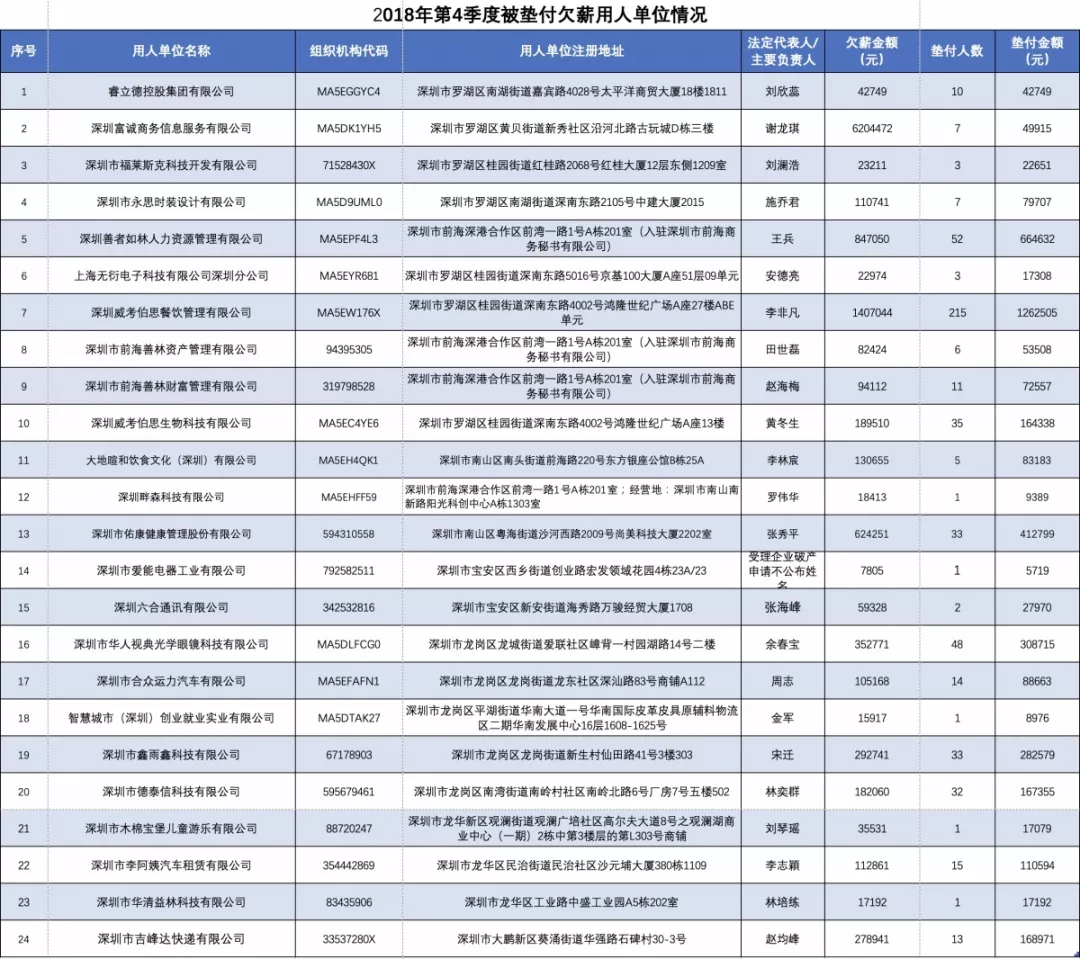 深圳新聞網(wǎng)2019年1月15日訊(記者 劉婷)據(jù)深圳人社消息,深圳近日公布2018年第4季度被墊付欠薪用人單位,此次被曝光的24家被墊付欠薪用人單位主要包括科技、餐飲、快遞等企業(yè)。其中,一餐飲企業(yè)欠薪最多,達(dá)140萬余元,被墊付欠薪金額達(dá)126萬余元。還有一家人力資源管理公司欠薪也達(dá)84萬余元,被墊付欠薪達(dá)66萬余元。