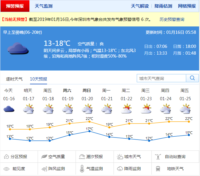 深圳新聞網(wǎng)2019年1月16日訊(記者 陳婕)記者從深圳市氣象局了解到,16日受冷空氣和切變線影響,陰天有分散小雨,天氣顯著轉(zhuǎn)涼,沿海和高地陣風6-7級;17-18日多云,可見陽光,早晚較冷;19-20日受偏東氣流影響,陰天間多云,間中有分散小雨。21日陰天有小雨轉(zhuǎn)多云,氣溫下降;22日起天氣晴朗干燥。