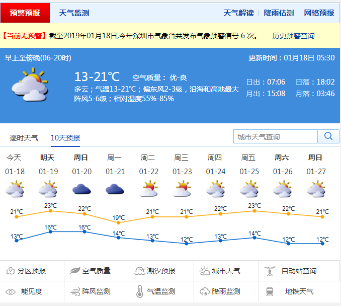深圳新聞網(wǎng)2019年1月18日訊(記者 陳婕)1月18日,深圳早上最低氣溫普遍在12-13℃,穿少了的同學是否在上班時瑟瑟發(fā)抖了?這兩天是洗洗曬曬的好日子,然后就可以準備過年了,預計今年深圳市不入冬了,畢竟沒有冬天的深圳,是常規(guī)操作。