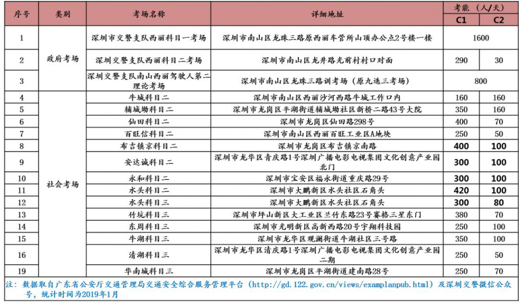 深圳市現(xiàn)有科目一考場1處,科目二考場9處,科目三考場6處,安全文明考場1處,考場具體情況如下: