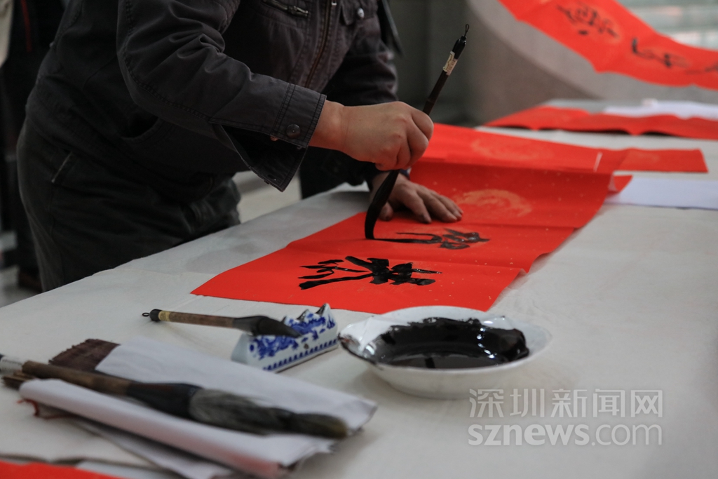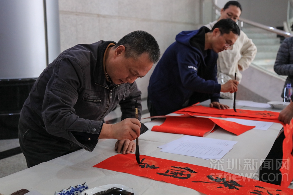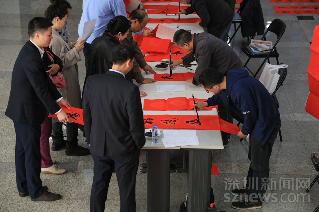 過年貼春聯(lián),是中華民族的傳統(tǒng)習俗之一??梢哉f,春聯(lián)一出,年味十足。記者在深圳商報大廈一樓活動現(xiàn)場看到,工作人員早已準備好了春聯(lián)的紅紙和筆墨,多位書法了得的記者編輯揮毫潑墨,創(chuàng)作出了一幅幅寓意喜慶吉祥的對聯(lián),并免費贈送給同事。不少人為了能拿到新鮮出爐的春聯(lián),提前在現(xiàn)場排隊等候。