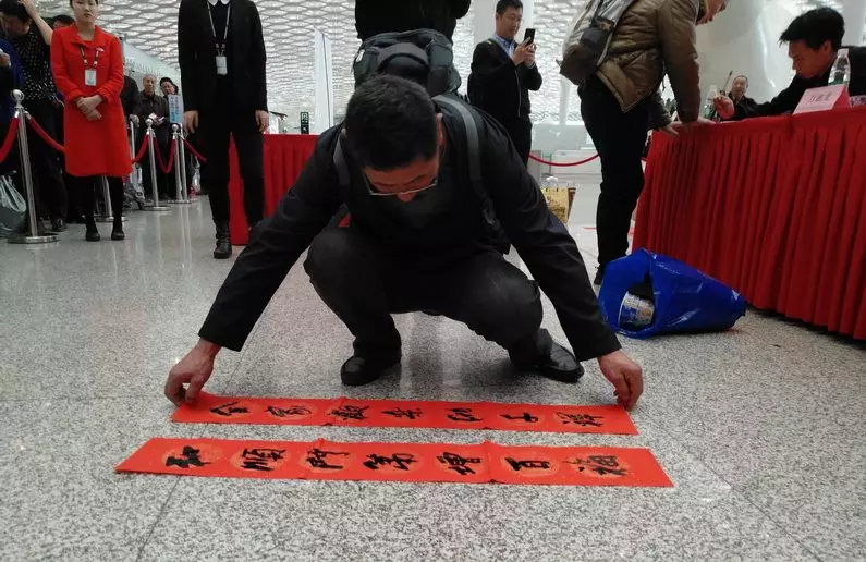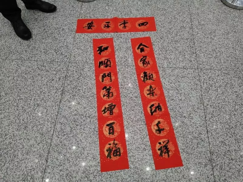 來自山東的譚先生剛從越南河內(nèi)務(wù)工回來,準(zhǔn)備轉(zhuǎn)機(jī)回山東煙臺,他選擇了“合家歡樂納千祥,和順門第增百?!?表達(dá)了他對家庭美滿的祝福。