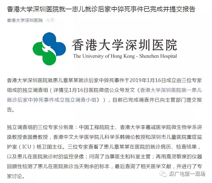 深廣電第一現(xiàn)場(chǎng)2019年2月1日訊 深圳8歲女孩患病前往香港大學(xué)深圳醫(yī)院就診,醫(yī)院兩次診斷均是上呼吸道感染,但孩子遵照醫(yī)囑吃完藥后病情并沒(méi)有好轉(zhuǎn)。在1月3日上午突然惡化,經(jīng)搶救無(wú)效死亡。 1月16日,香港大學(xué)深圳醫(yī)院發(fā)布消息稱,香港大學(xué)深圳醫(yī)院就患兒章某某就診后家中猝死事件成立獨(dú)立調(diào)查組。 1月31日,香港大學(xué)深圳醫(yī)院再次發(fā)布消息,稱就患兒就診后家中猝死事件已完成調(diào)查并提交報(bào)告。全文如下: 香港大學(xué)深圳醫(yī)院就患兒章某某就診后家中猝死事件于2019年1月16日成立由三位專家組成的獨(dú)立調(diào)查組(詳情見(jiàn)1月16日醫(yī)院微信公眾號(hào)發(fā)文《香港大學(xué)深圳醫(yī)院就一患兒就診后家中猝死事件成立獨(dú)立調(diào)查小組》),目前已完成調(diào)查并已向主管部門提交報(bào)告。 獨(dú)立調(diào)查組的三位專家分別是:中國(guó)工程院院士、香港大學(xué)李嘉誠(chéng)醫(yī)學(xué)院微生物學(xué)系講座教授袁國(guó)勇教授,香港中文大學(xué)醫(yī)學(xué)院兒科學(xué)系韓錦倫教授和深圳市兒童醫(yī)院重癥監(jiān)護(hù)室(ICU)楊衛(wèi)國(guó)主任。三位專家查看了患兒章某某在醫(yī)院的就診病歷、檢查結(jié)果,以及患兒在醫(yī)院就診時(shí)的監(jiān)控錄像;問(wèn)詢了當(dāng)事醫(yī)生和科室主管;再用高靈敏度的儀器回顧性檢測(cè)了患兒在醫(yī)院就診當(dāng)天剩余的標(biāo)本,最后查詢了相關(guān)醫(yī)學(xué)文獻(xiàn),并進(jìn)行了專家討論。 三位專家已出具了最終調(diào)查報(bào)告。報(bào)告確定了患兒感染的類型,分析了患兒猝死的原因很可能為心源性并發(fā)癥,并為今后避免類似事件再次發(fā)生提供了建議。報(bào)告指出醫(yī)院的診療過(guò)程符合專業(yè)規(guī)范。 2019年1月25日上午,醫(yī)院已將報(bào)告的內(nèi)容悉數(shù)告知患兒章某某家長(zhǎng),并對(duì)家長(zhǎng)進(jìn)行了慰問(wèn)。同日,醫(yī)院也將報(bào)告上報(bào)給了主管部門。 由于報(bào)告的部分內(nèi)容涉及患兒及其家人隱私,以及報(bào)告的部分內(nèi)容依據(jù)《中華人民共和國(guó)傳染病防治法》規(guī)定,醫(yī)院沒(méi)有權(quán)限向公眾公開(kāi),所以醫(yī)院無(wú)法公布報(bào)告全文。 醫(yī)院一直秉持公開(kāi)、專業(yè)、科學(xué)的方式處理這一個(gè)案,尋求真相,并依此對(duì)診療工作進(jìn)行持續(xù)改進(jìn),促進(jìn)醫(yī)學(xué)的進(jìn)步。醫(yī)院也正在等待第三方的尸檢結(jié)果。 最后,醫(yī)院對(duì)獨(dú)立調(diào)查組的三位專家致以誠(chéng)摯的謝意,感謝他們?cè)诙潭虜?shù)天時(shí)間內(nèi),認(rèn)真、細(xì)致、嚴(yán)謹(jǐn)?shù)赝瓿闪苏{(diào)查,并撰寫(xiě)了報(bào)告。 香港大學(xué)深圳醫(yī)院 2019年1月31日