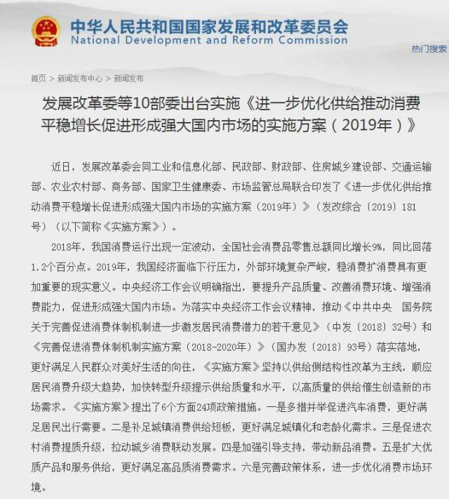 1月29日,“看不過去”的發(fā)改委就印發(fā)了《進一步優(yōu)化供給推動消費平穩(wěn)增長促進形成強大國內(nèi)市場的實施方案(2019年)》