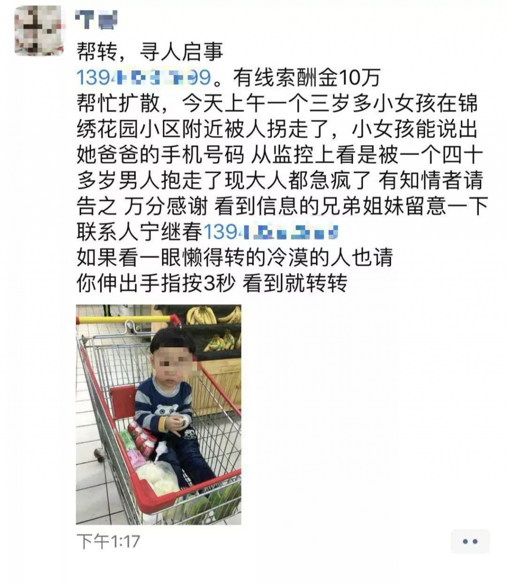 2月10日晚間,不少人的微信朋友圈被一條尋人消息刷屏。消息稱,一名3歲女孩在錦繡花園小區(qū)附近被人拐走,小女孩能說出她爸爸的手機(jī)號(hào)碼。從監(jiān)控上看,她是被一名40多歲的男人抱走了。