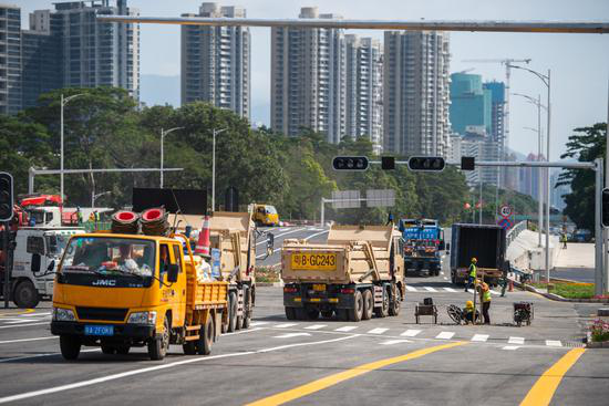 施工車輛穿梭施工現(xiàn)場。