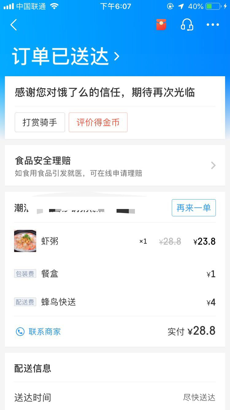 2月12日上午10點(diǎn)多,市民黃先生在餓了么外賣平臺(tái)點(diǎn)了一份潮汕砂鍋粥。2個(gè)小時(shí)后,肚子快餓癟的黃先生等到了外賣小哥的電話。外賣小哥告訴他,外賣在電動(dòng)車上被偷了,對(duì)此很抱歉,麻煩黃先生重新點(diǎn)餐,并希望添加他的微信進(jìn)行賠償。