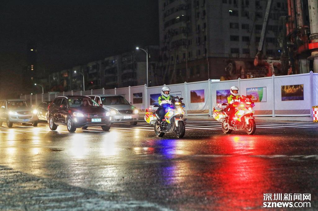 在深圳交警鐵騎帶領(lǐng)下,社會(huì)車(chē)輛有序通過(guò)黃木崗十字路口