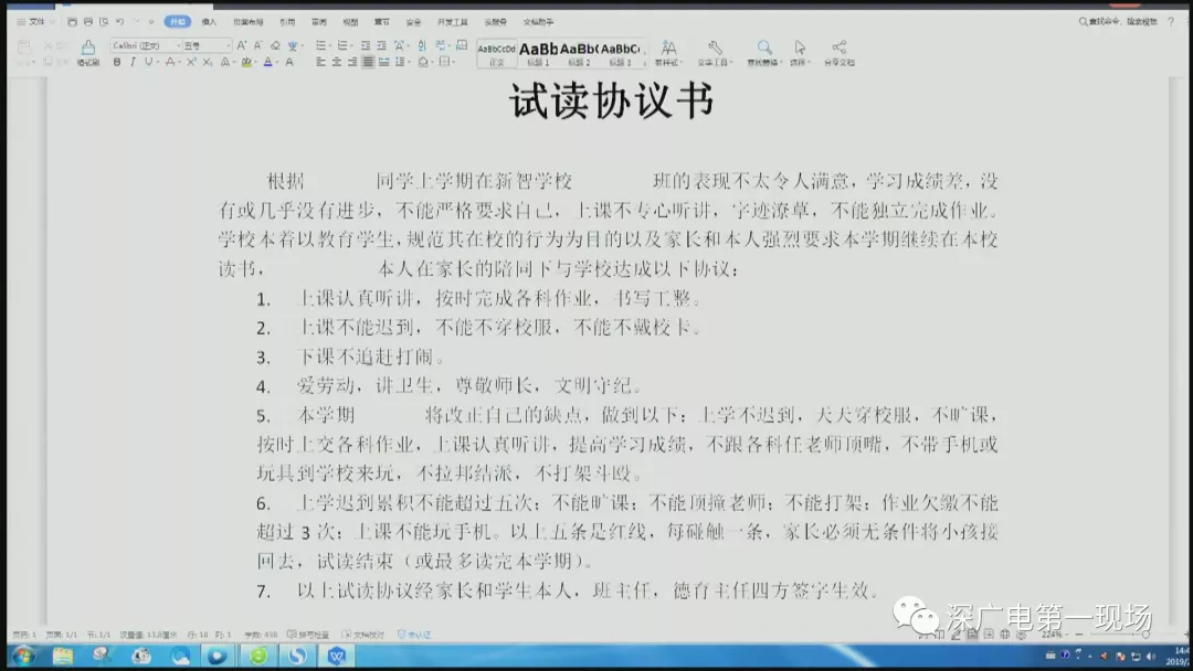 以陳先生為例,他孩子的學(xué)習(xí)成績(jī)不是很理想。陳先生說,昨晚他收到了班主任的通知,說是要簽訂《試讀協(xié)議書》,才能到學(xué)校報(bào)名。陳先生仔細(xì)閱讀了《試讀協(xié)議》的內(nèi)容之后,徹夜難眠。