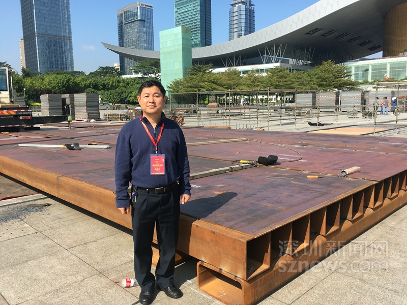 王啟文他們決定采用“遇河架橋”的思路,以跨越方式,在12米的方型鋼管梁鋪上鋼板,沿軸線位置設(shè)一個(gè)縱向梁,再通過(guò)3米的橫梁跨越過(guò)去。相當(dāng)于在市民中心的采光帶上架了一座橋,所有的舞臺(tái)搭設(shè)都在“橋”面上施工。由于方案和施工緊急,從安全考慮,設(shè)計(jì)單位還為這個(gè)工程做了及時(shí)的變形觀測(cè),鋪設(shè)了很多傳感儀,每天都在傳輸舞臺(tái)搭建后對(duì)地面造成的變形數(shù)據(jù),為舞臺(tái)的安全搭建提供技術(shù)支持。