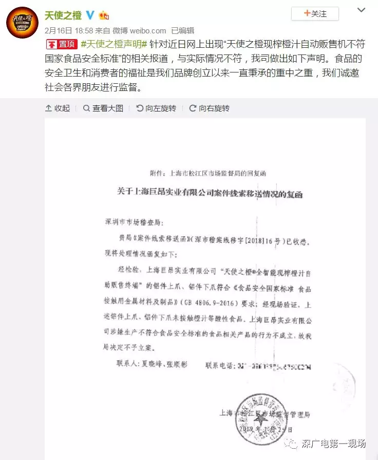 2月16日,“天使之橙”官方發(fā)表聲明,稱上海市松江區(qū)市場(chǎng)監(jiān)管局經(jīng)過(guò)現(xiàn)場(chǎng)檢查,并送第三方檢測(cè)機(jī)構(gòu)檢測(cè),認(rèn)為“上下爪”并不會(huì)接觸橙汁等酸性食品,巨昂方面涉嫌違反《食品安全法》的相關(guān)行為不成立,該局不予立案。