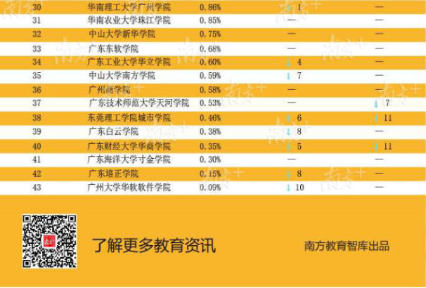 近3年各高職升學(xué)數(shù)據(jù)顯示,越來(lái)越多畢業(yè)生通過(guò)升學(xué)提升自身競(jìng)爭(zhēng)力,尤其2018屆升學(xué)率增長(zhǎng)明顯。其中有7所高職院校的畢業(yè)生升學(xué)率達(dá)到或超過(guò)7%,分別是廣州松田職業(yè)學(xué)院9.96%、廣東行政職業(yè)學(xué)院9.62%、廣東郵電職業(yè)技術(shù)學(xué)院8.73%、廣州華商職業(yè)學(xué)院8.06%、東莞職業(yè)技術(shù)學(xué)院8.05%、廣東水利電力職業(yè)技術(shù)學(xué)院7.73%和廣東科貿(mào)職業(yè)學(xué)院7.00%。
