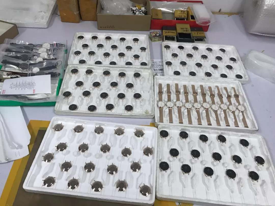 2018年6月21日,深圳市公安局經偵支隊聯(lián)合市市場監(jiān)管部門開展打擊假冒DW品牌手表、FOREO等品牌潔面儀收網行動,共出動警力110人,查處窩點13個,刑拘犯罪嫌疑人12人?,F場查扣假冒DW品牌手表13500塊,表帶、表殼、后蓋等配件43000個以及包裝盒、標簽12000余個,現場查扣假冒產品價值1200萬元人民幣,總涉案金額3000余萬元人民幣。查扣假冒各品牌美容產品、半成品和商標標識11798件,查扣假冒產品價值人民幣500萬元。經查,上述犯罪團伙在未經注冊商標所有人許可的情況下,擅自使用注冊的商標圖案組裝、翻新假冒DW品牌手表、FOREO品牌潔面儀。經商標權利人鑒定,現場查獲的手表和美容儀為假冒其注冊商標的產品。