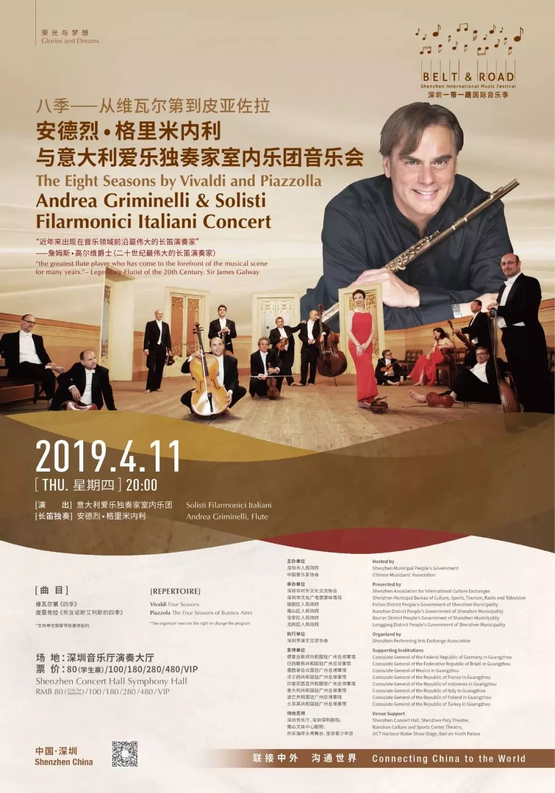 長(zhǎng)笛名家安德烈 格里米內(nèi)利,世界三大男高音之一帕瓦羅蒂推崇的長(zhǎng)笛大師,攜意大利愛樂獨(dú)奏家室內(nèi)樂團(tuán),首次到訪深圳,用音樂鏈接跨越時(shí)空的《四季》。