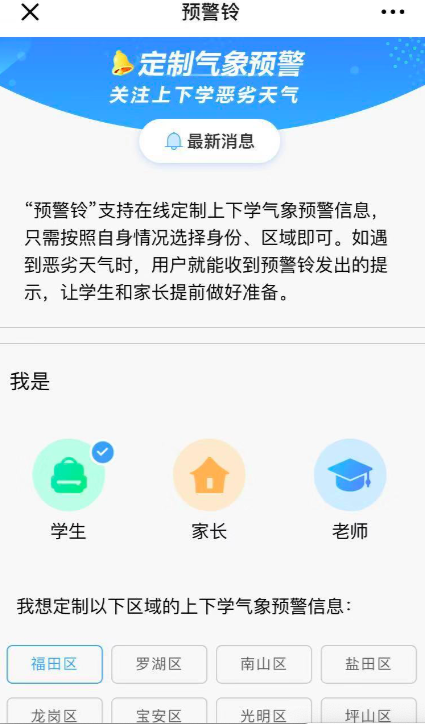 開學首日,深圳市氣象局就聯(lián)合深圳市教育局推出上下學時段高級別臺風暴雨預警提示服務——“預警鈴”,廣大學生和家長可以通過關注“深圳天氣”微信公眾號進入“市民互動→預警鈴”頁面定制上下學預警信息,及時掌握自己所在區(qū)域的天氣狀況,合理安排出行,保障學生安全。