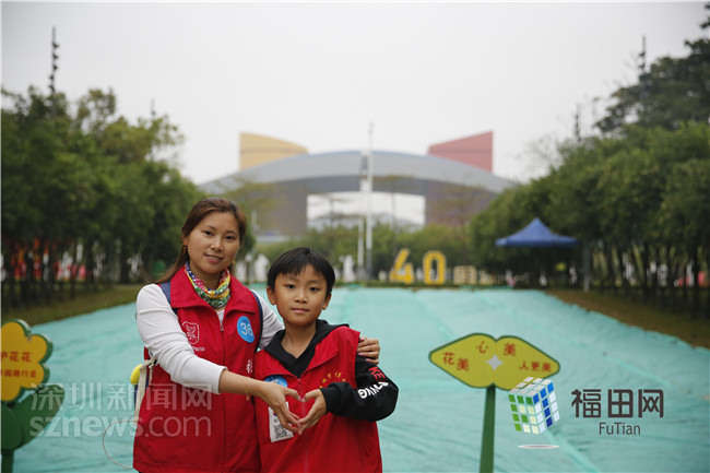 家長(zhǎng)志愿者帶著孩子和花田合影。