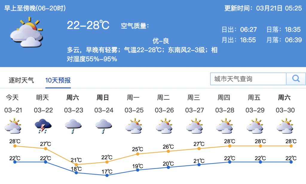 距離深圳平均入夏時間4月21日還有一個月,市民們也許已經(jīng)有了初夏般的感受。預(yù)計21日多云間陰天,早晚有輕霧,氣溫23~28 ℃。