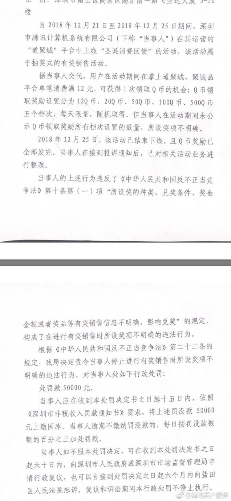 為解答網友疑惑,當天晚間,微博賬號騰訊用戶服務公開發(fā)布了該處罰決定書,決定書中提到,2018年12月21日 -25日期間,深圳市騰訊計算機系統有限公司(下稱"當事人")在其運營的"道聚城"平臺中上線"圣誕消費回饋"的活動,該活動屬于抽獎式的有獎銷售活動。