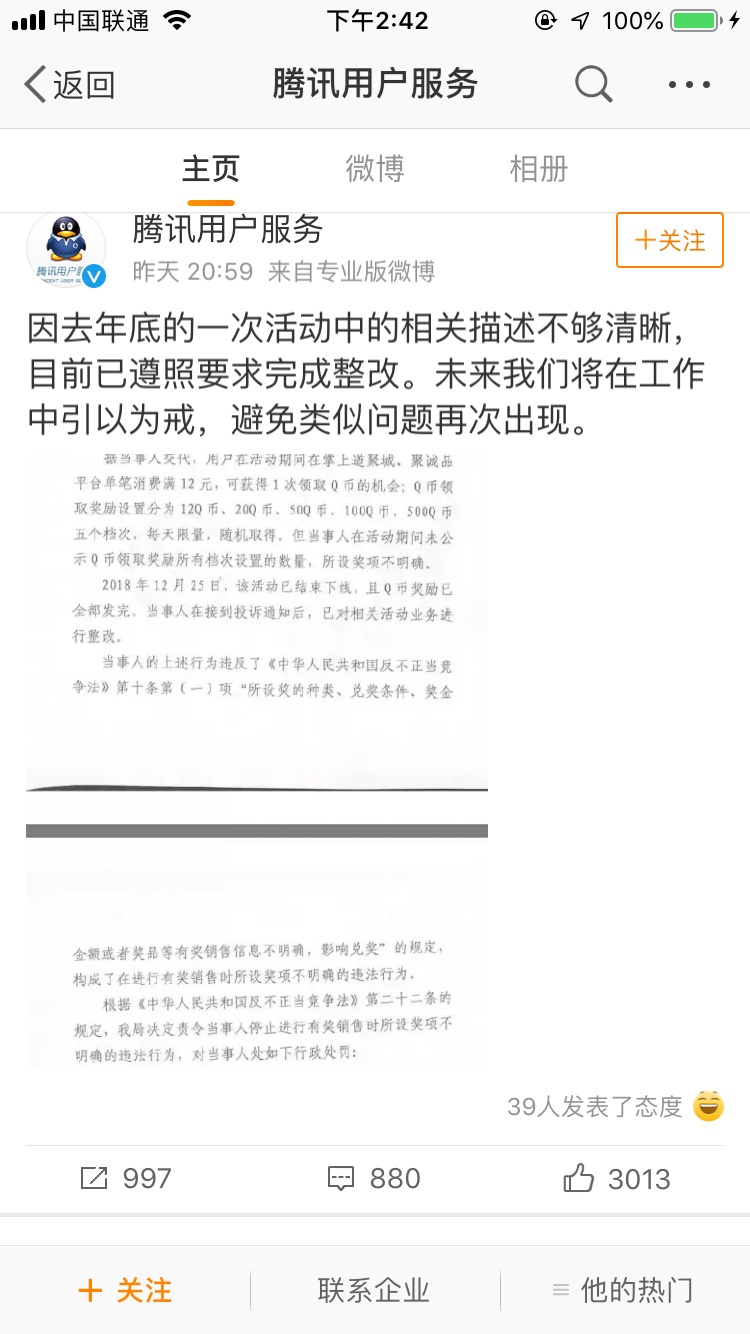 3月20日,微博認證為騰訊公司公關總監(jiān)張軍在微博中解釋:因去年年底的一次活動中的相關描述不夠清晰,目前已遵照要求完成整改。未來我們將在工作中引以為戒,避免類似問題再次出現。