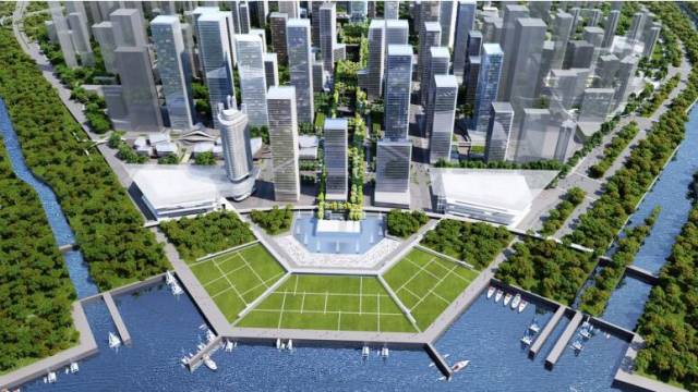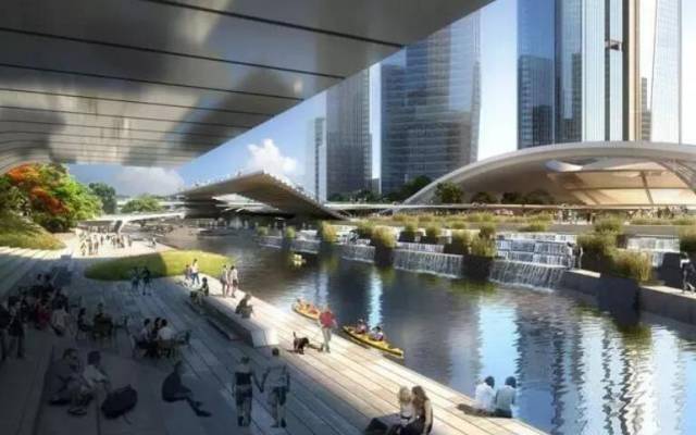 該方案中規(guī)劃了國際交流會(huì)議中心、城市演藝中心、城市博物館及雙子金融大廈等,以及地景式過街天橋、中央綠谷公園等。