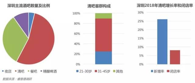 報(bào)告著重以夜店、清吧、餐吧、精釀啤酒吧為主要研究對(duì)象。其中,清吧的數(shù)量在主流酒吧業(yè)態(tài)中占比過半——2018年,清吧在深圳超過600家,占據(jù)市場(chǎng)的54%,開業(yè)量超過130家,閉店數(shù)則超過40家,精細(xì)運(yùn)營(yíng)成為追求現(xiàn)象級(jí)爆紅的“網(wǎng)紅”酒吧發(fā)展的主要瓶頸。