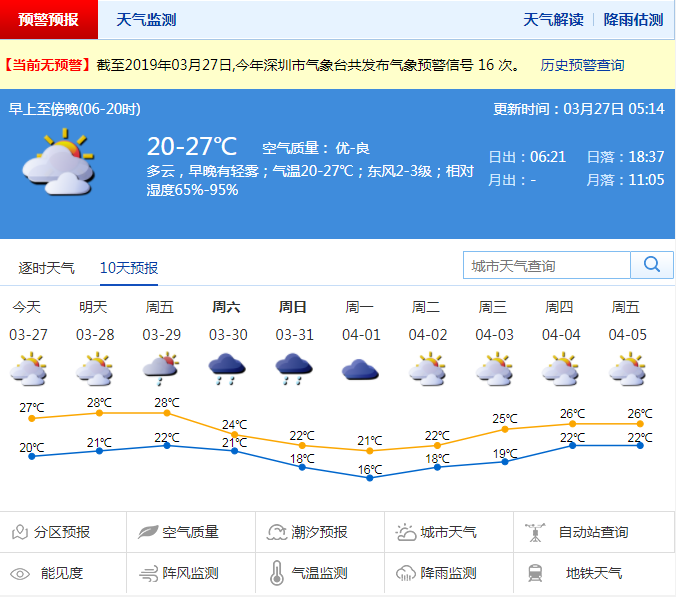 深圳新聞網(wǎng)2019年3月27日訊 深圳今日多云,早晚有輕霧;氣溫20-27℃,相對濕度65%-95%;東北風(fēng)2-3級。預(yù)計(jì)28日多云間晴,氣溫繼續(xù)回升,早晚有輕霧或霧;29日多云轉(zhuǎn)雷陣雨;30-31日冷空氣影響,我市陰天有陣雨或雷陣雨,日溫差小,天氣明顯轉(zhuǎn)涼;4月1日陰天轉(zhuǎn)多云,偶有零星小雨。