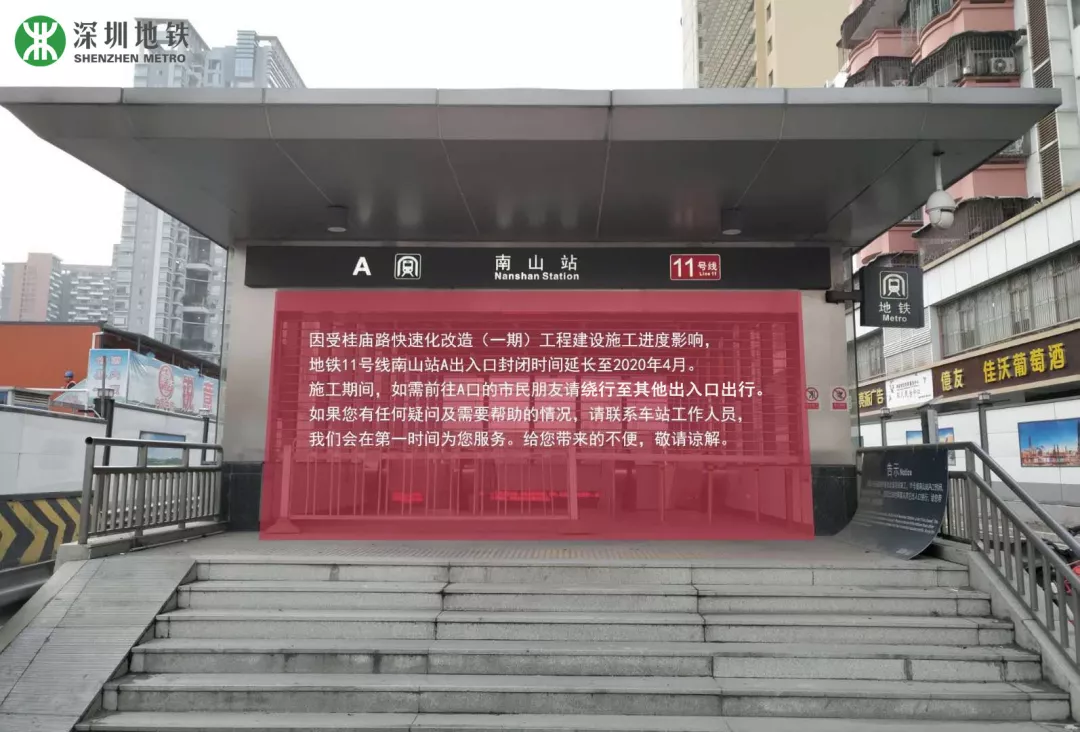 因受桂廟路快速化改造(一期)工程建設(shè)施工進度影響,11號線南山站A出入口封閉時間將延長至2020年4月。施工期間,如需前往A口的市民朋友請繞行至其他出入口出行,如果您有任何疑問及需要幫助的情況,請聯(lián)系車站工作人員,我們會在第一時間為您服務(wù)。給您帶來的不便,敬請諒解。