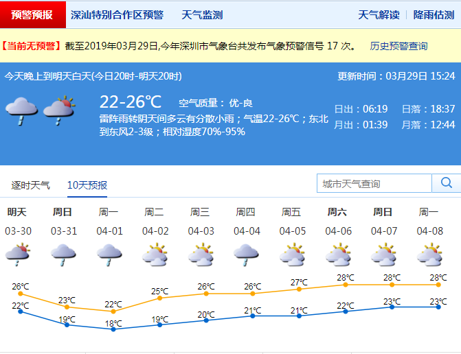 深圳新聞網(wǎng)2019年3月29日訊 記者從深圳氣象局了解到,昨天夜間到今天白天,我市多云,夜間到早晨有輕霧,局地大霧;早晨最低氣溫22-23℃,白天最高氣溫27-28℃;相對濕度70%-100%;南風(fēng)2-3級;昨天夜間能見度1-5公里。東部局地有大霧能見度在1公里以下,白天能見度轉(zhuǎn)好達(dá)到10-20公里。