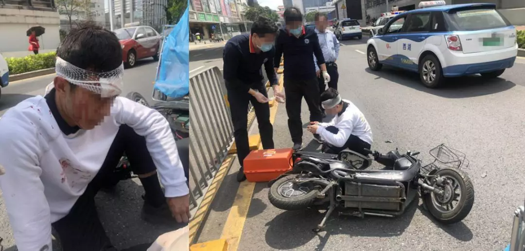 由反向橫穿馬路而來的電動車與曾某駕駛的出租車發(fā)生碰撞,電動車應聲倒地,駕駛員吳某頭部受傷,流血不止,電動車受損嚴重!