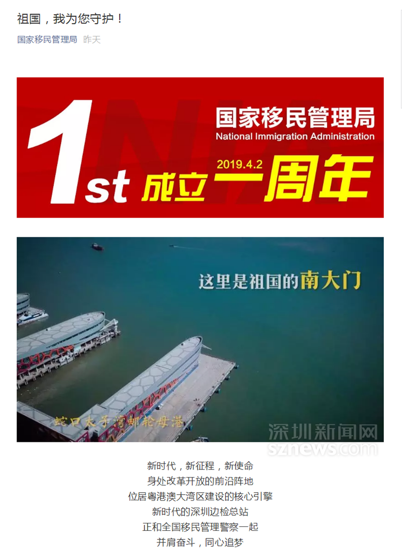 深圳新聞網(wǎng)4月4日訊(記者 張玲 通訊員 張鋮)2019年4月2日是國家移民管理局掛牌一周年,4月3日,國家移民管理局微信公眾號發(fā)布微視頻《祖國,我為您守護(hù)!》。