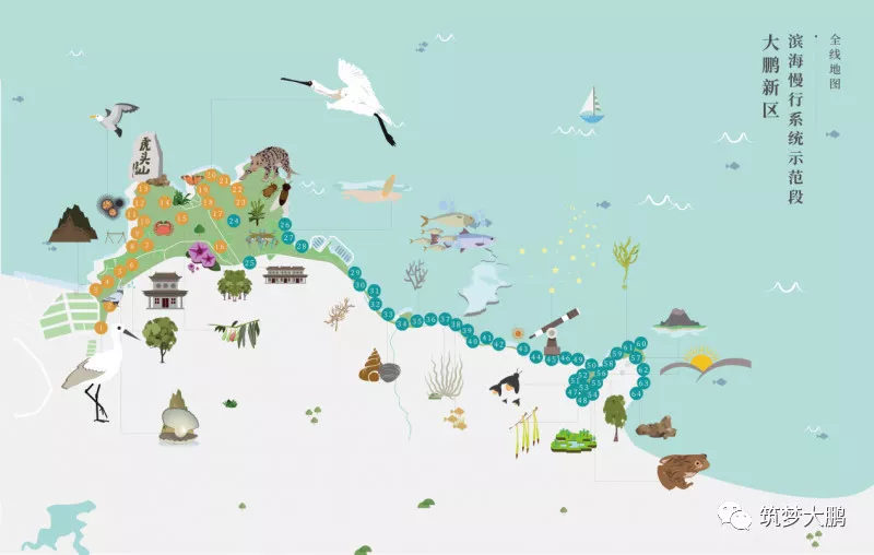 大鵬新區(qū)根據(jù)線路的地形、山海景觀、人文景觀的分布,確定了“打造‘兩線、三段、五大節(jié)點’的濱海生態(tài)自然課堂步道”。據(jù)新區(qū)建筑工務局負責人介紹,從新大河入??诘酱髞啚澈0堵咕讘已拢L18.7公里的海岸線上分布著河流、山林、海灘、溪流、濕地等多樣生態(tài)系統(tǒng)。2017年7月,大鵬新區(qū)按照濱海慢行系統(tǒng)示范工程標準,動工建設新大-鹿嘴市政綠道?!皟删€”指的是沿著海岸的濱海徒步路線和城市二號綠道線,兩條線之間的6.6平方公里土地將形成一座開放的郊野公園;“三段”分別為活力生活段、自然生態(tài)段和休閑旅游段;“五大節(jié)點”為山海綠畔、古廟遺風、東山凹、愛情灘、鹿咀山莊等自然景觀。