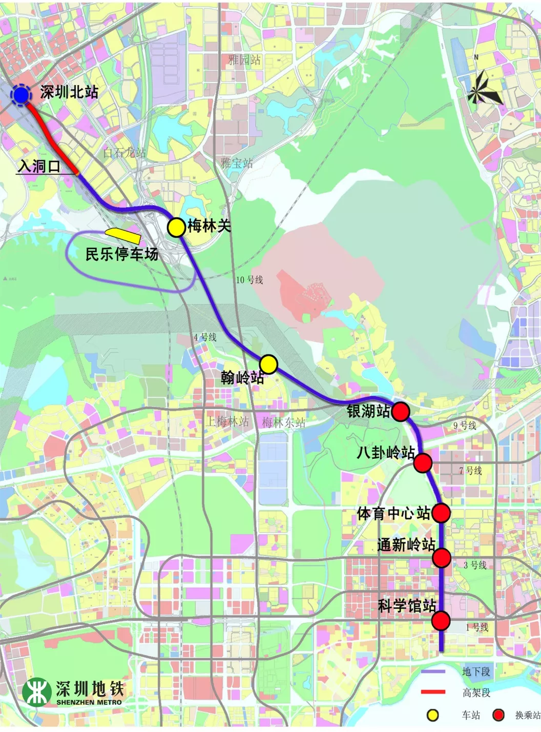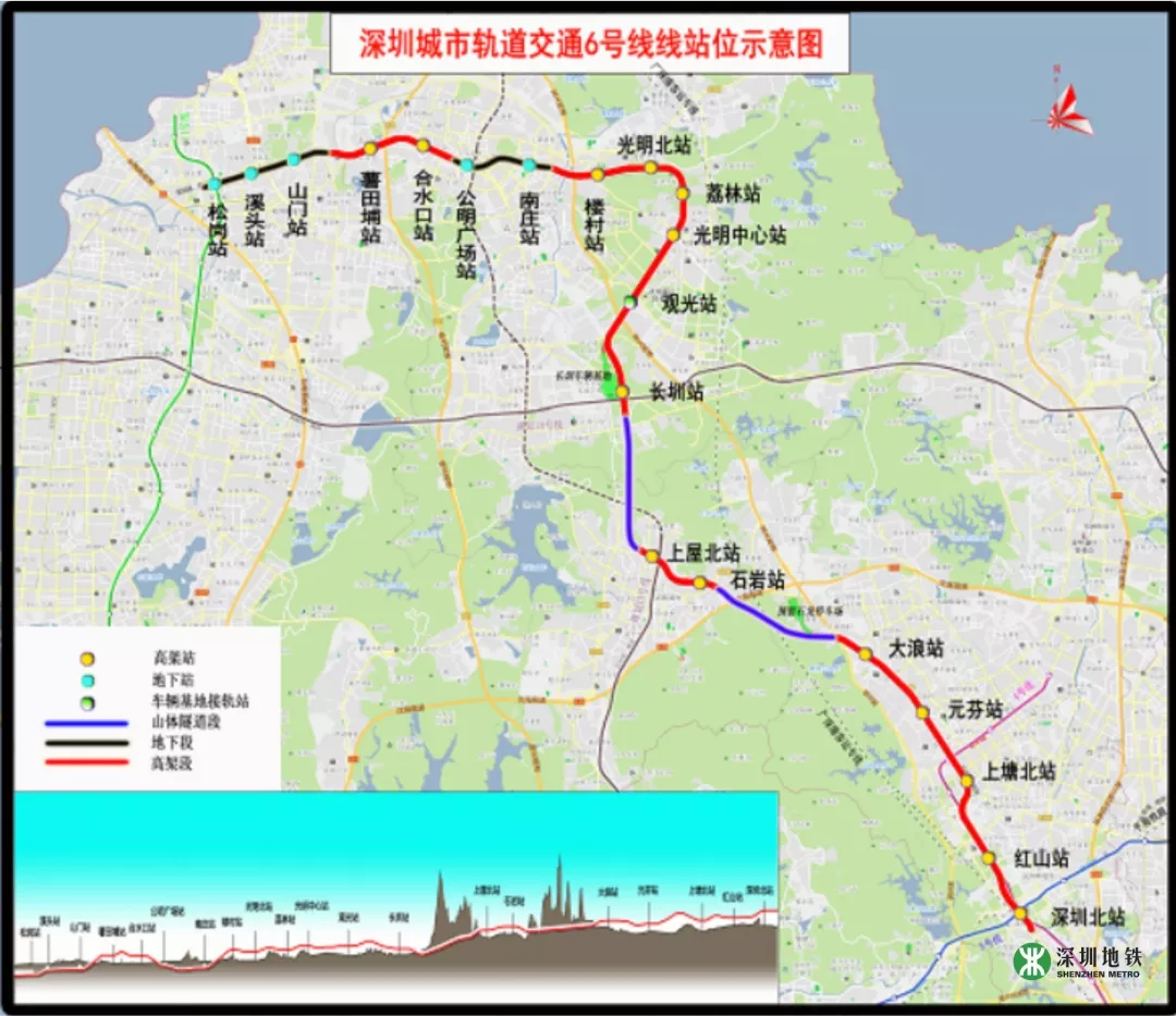 深圳地鐵6號(hào)線一期工程全長(zhǎng)約49.4km,其中一期工程長(zhǎng)約37.6km,起自深圳北站綜合交通樞紐,終止于松崗站,設(shè)車(chē)站20座(其中地下站5座,高架站15座),與4、5、11、13、15號(hào)線及廣深港客運(yùn)專(zhuān)線綜合換乘。