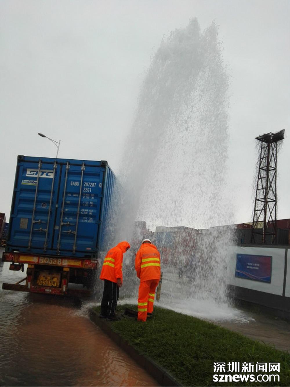 航海路(鹽港堆場)旁消火栓被大貨車撞斷,前海分公司工作人員立即出動,及時搶修完畢