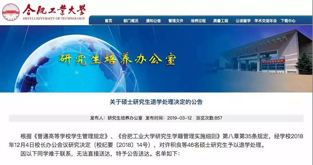 對(duì)46名碩士研究生予以退學(xué)處理,因其在學(xué)校規(guī)定的最長(zhǎng)學(xué)習(xí)年限內(nèi)未完成學(xué)業(yè),或超過(guò)學(xué)校規(guī)定期限未注冊(cè)而又無(wú)正當(dāng)理由,且未經(jīng)請(qǐng)假離校連續(xù)兩周未參加學(xué)校的教學(xué)活動(dòng)。