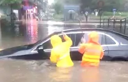 只見積水已經(jīng)浸沒半個(gè)車身