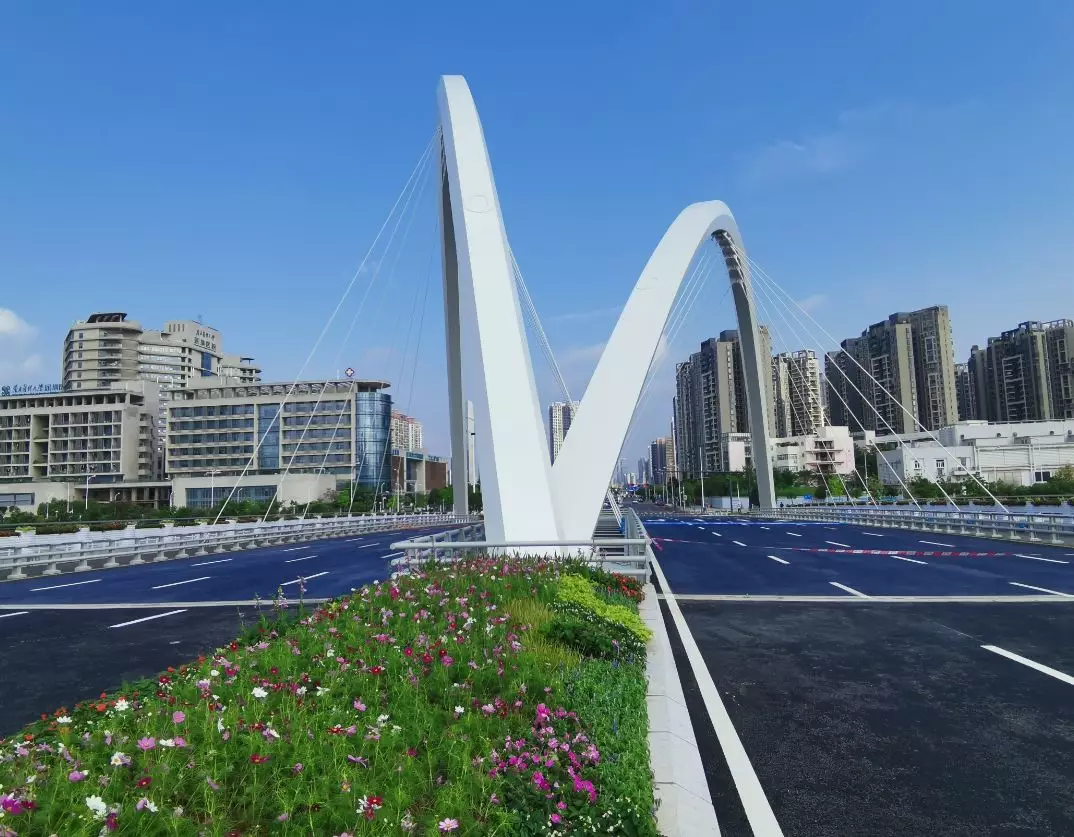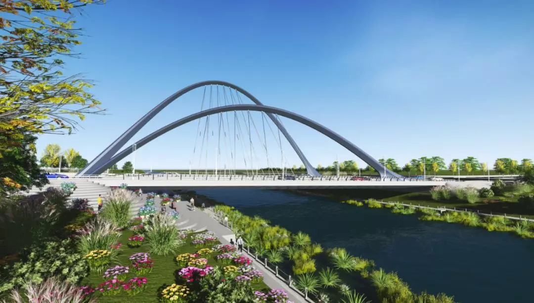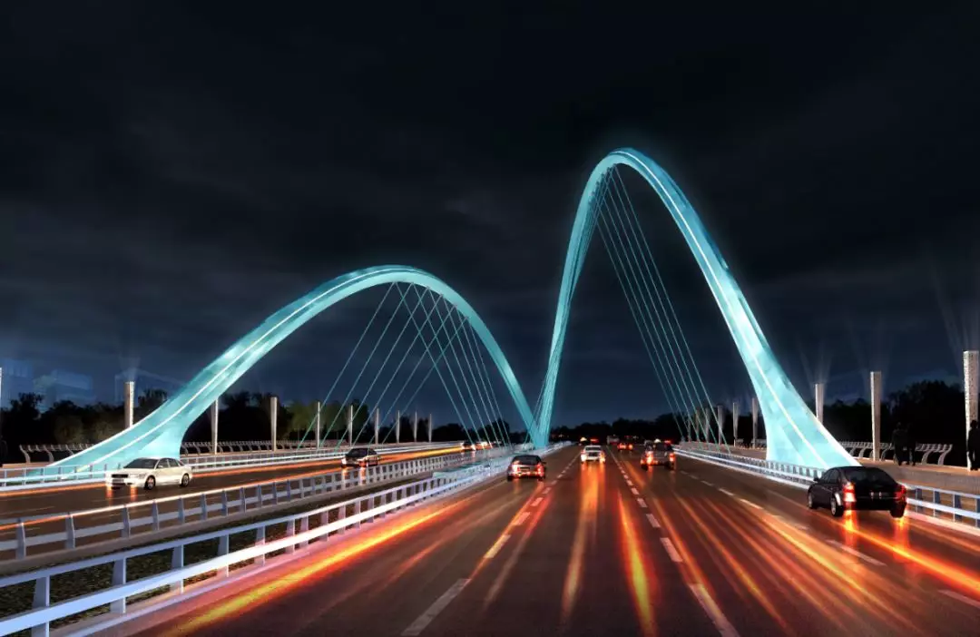 11號(hào)景觀橋以“融合”為主題,將流暢的線條融入景觀橋梁中,兩幅高低拱的線條無限延伸,猶如行云流水般瀟灑寫意,一氣呵成;同時(shí),匯聚為一體的主拱又形成了“門”的形象符號(hào),迎接著八方來客。