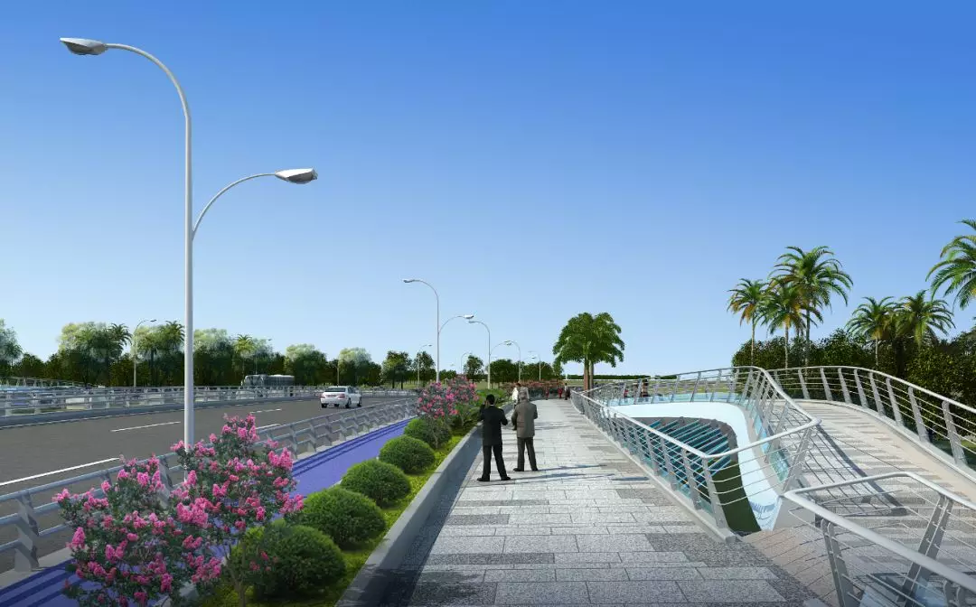 6號(hào)景觀橋以海浪為主題,橋體采用流線的曲面梁造型,在橋下形成富有視覺沖擊力的海洋波浪意象,同時(shí)以快慢分離、環(huán)境融合為設(shè)計(jì)理念,將橋梁、城市、綠地和水充分融合,形成一個(gè)多層次富于變化的橋梁空間,橋梁雙曲面造型奇特,屬于國(guó)內(nèi)第一無二的景觀橋。