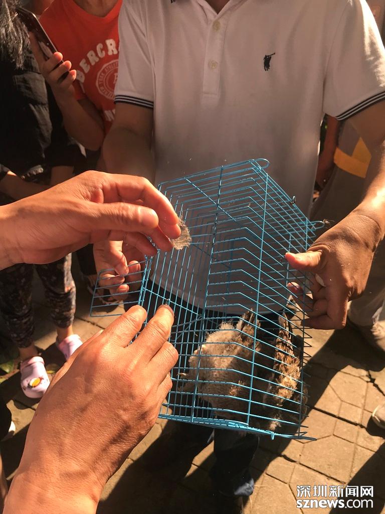 小區(qū)保安先把小貓頭鷹裝進(jìn)籠子,等待動保所的工作人員到來。深圳新聞網(wǎng)記者 施翔東 攝