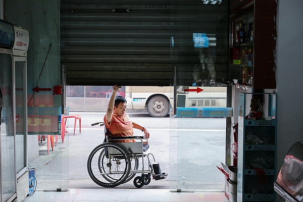 初見彭水林,他肚臍以下已全部截去,兩根直接連接腎臟的軟管用來排尿,大便排泄則通過人造肛門完成。令人不敢相信的是,這樣的他,能夠熟練地拉開位于在長沙城東芙蓉區(qū)“沁園”小區(qū)岔路口——“半截人便利店”的那道厚重的卷閘門。卷閘門徐徐升起,三世同堂的他抱著孫女,就這樣開始了一天的工作。