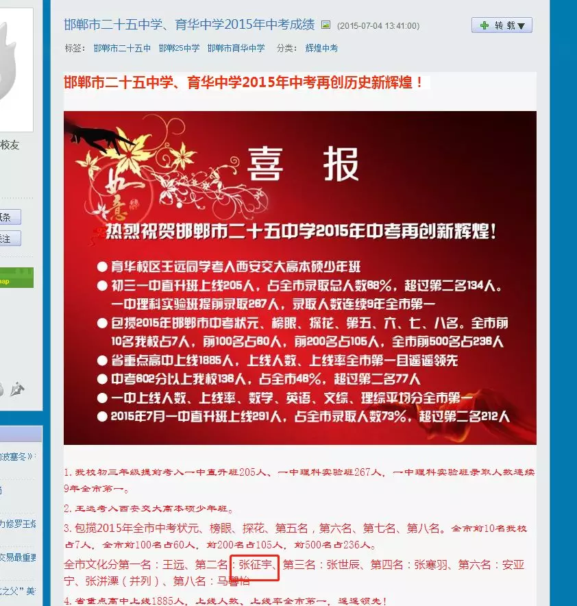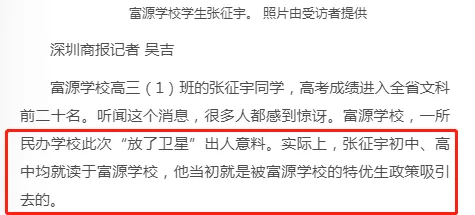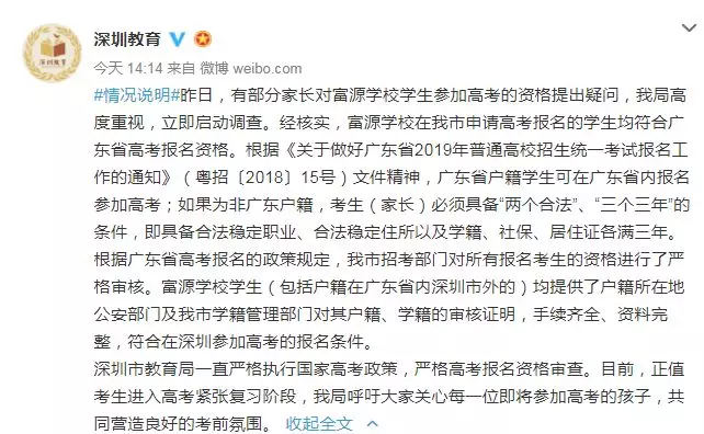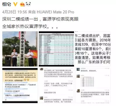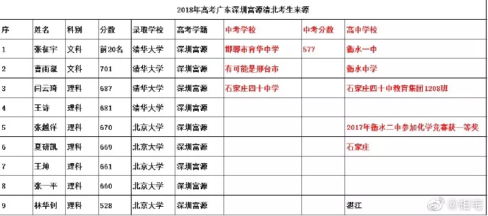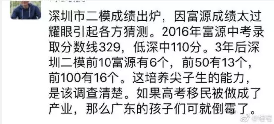 近日,深圳高三二模成績(jī)出爐,一所學(xué)校引起了深圳家長(zhǎng)圈的高度關(guān)注。 有網(wǎng)友在微博上報(bào)料富源學(xué)校表現(xiàn)亮眼,一石激起千層浪,事件是怎么一回事呢?一起來(lái)看看 2019深二模各校尖子生成績(jī) 其中民辦學(xué)校寶安區(qū)富源學(xué)校異軍突起,尖子生占比遠(yuǎn)超深圳最好的四大高中(深圳中學(xué),深圳實(shí)驗(yàn)中學(xué),深圳外國(guó)語(yǔ)學(xué)校,深圳高級(jí)中學(xué)),引人注目。 網(wǎng)友議論紛紛 網(wǎng)友@相宅稱:深圳富源中學(xué),18年考中清北的學(xué)生名單和初中來(lái)源統(tǒng)計(jì),經(jīng)過(guò)人肉搜索和大數(shù)據(jù)比對(duì),確認(rèn)相關(guān)證據(jù),有非常大的高考移民嫌疑。廣東高考本來(lái)就難,名校指標(biāo)更少,還來(lái)擠占惹起公憤。同時(shí)附上19年深圳高考二模的富源成績(jī)。今年還有沒(méi)有高考移民,還會(huì)不會(huì)擠占廣東的名校指標(biāo)? 針對(duì)網(wǎng)上的報(bào)料和家長(zhǎng)的質(zhì)疑,深圳教育局@深圳教育回應(yīng)稱 情況說(shuō)明 #情況說(shuō)明#昨日,有部分家長(zhǎng)對(duì)富源學(xué)校學(xué)生參加高考的資格提出疑問(wèn),我局高度重視,立即啟動(dòng)調(diào)查。經(jīng)核實(shí),富源學(xué)校在我市申請(qǐng)高考報(bào)名的學(xué)生均符合廣東省高考報(bào)名資格。根據(jù)《關(guān)于做好廣東省2019年普通高校招生統(tǒng)一考試報(bào)名工作的通知》(粵招〔2018〕15號(hào))文件精神,廣東省戶籍學(xué)生可在廣東省內(nèi)報(bào)名參加高考;如果為非廣東戶籍,考生(家長(zhǎng))必須具備“兩個(gè)合法”、“三個(gè)三年”的條件,即具備合法穩(wěn)定職業(yè)、合法穩(wěn)定住所以及學(xué)籍、社保、居住證各滿三年。根據(jù)廣東省高考報(bào)名的政策規(guī)定,我市招考部門(mén)對(duì)所有報(bào)名考生的資格進(jìn)行了嚴(yán)格審核。富源學(xué)校學(xué)生(包括戶籍在廣東省內(nèi)深圳市外的)均提供了戶籍所在地公安部門(mén)及我市學(xué)籍管理部門(mén)對(duì)其戶籍、學(xué)籍的審核證明,手續(xù)齊全、資料完整,符合在深圳參加高考的報(bào)名條件。 深圳市教育局一直嚴(yán)格執(zhí)行國(guó)家高考政策,嚴(yán)格高考報(bào)名資格審查。目前,正值考生進(jìn)入高考緊張復(fù)習(xí)階段,我局呼吁大家關(guān)心每一位即將參加高考的孩子,共同營(yíng)造良好的考前氛圍。 回應(yīng)之下,小編根據(jù)現(xiàn)有的資料,發(fā)現(xiàn)了這些信息出入,一起接著往下看! 對(duì)比:富源學(xué)校深圳一模成績(jī) 成績(jī)單顯示,在前十名單里,富源學(xué)校獨(dú)占6位,而深圳四大公辦重點(diǎn)高中總和也只有4位,這是什么情況?對(duì)照看一看一模成績(jī): 三年來(lái)深圳中考錄取情況: 富源學(xué)??梢?jiàn)生源不占優(yōu)勢(shì) 再來(lái)看一看三年來(lái)深圳中考錄取情況:富源學(xué)??梢?jiàn)生源并沒(méi)有什么優(yōu)勢(shì),總分460分的錄取分?jǐn)?shù)比四大重點(diǎn)低了將近100分,但也不能因此說(shuō)明該學(xué)校沒(méi)有尖子生源。 2018年富源學(xué)校高考清北名單:9位同學(xué)上清北 下圖是2018年幾所大學(xué)在廣東(理科)招生計(jì)劃: 但是,這幾名考進(jìn)清北的同學(xué),名字竟然出現(xiàn)在兩所不同的高中??? 考進(jìn)廣東前20名的張征宇同學(xué) 網(wǎng)友爆料稱,深圳富源中學(xué)2018年高考喜報(bào),特別宣傳了張征宇同學(xué)(后成功考入清華大學(xué))。而他也出現(xiàn)在2015年的邯鄲市育華中學(xué)中考喜報(bào)上。乾坤大挪移,坐地日行八萬(wàn)里! 家長(zhǎng)質(zhì)疑:富源中學(xué)光榮榜的同學(xué) 怎么又出現(xiàn)在衡水中學(xué)喜報(bào)上? 針對(duì)上面9位同學(xué),搜索信息顯示,竟然有五位同學(xué)來(lái)自有名的高考大省河北。 在2018年的第31和32屆化學(xué)奧林匹克競(jìng)賽的名單上,有一個(gè)共同的名字:崔一龍,但他們來(lái)自不同的學(xué)校。高二時(shí)他在衡水第一中學(xué),高三他出現(xiàn)在深圳富源中學(xué)。 同時(shí),該網(wǎng)友還發(fā)了一封 #一位深圳中學(xué)生家長(zhǎng)寫(xiě)給教育部的控訴信# 尊敬的國(guó)家教育部領(lǐng)導(dǎo): 您好! 我是深圳市一名中學(xué)生的家長(zhǎng)。這幾日網(wǎng)上流傳出一份深圳市高三年級(jí)第二次模擬考試前幾名學(xué)校分布成績(jī)單,其中民辦學(xué)校寶安區(qū)富源學(xué)校異軍突起,遠(yuǎn)超深圳最好的四大高中(深圳中學(xué),深圳實(shí)驗(yàn)中學(xué),深圳外國(guó)語(yǔ)學(xué)校,深圳高級(jí)中學(xué))引起廣大家長(zhǎng)的關(guān)注。隨后網(wǎng)上流傳出是富源學(xué)校與河北衡水中學(xué)之間的高考移民消息,具體操作是通過(guò)將河北衡水中學(xué)的尖子生戶口轉(zhuǎn)移到深圳富源學(xué)校,平時(shí)在衡水中學(xué)上課,考試在深圳富源學(xué)校,并參加深圳市高考。此情況幾年前已有,數(shù)量沒(méi)有那么大。今年突然大量此類考生出現(xiàn),大家猜測(cè),如果不加管控未來(lái)必將愈演愈烈。 作為一名普通深圳市民和學(xué)生家長(zhǎng),我守法遵紀(jì),但是實(shí)在難以接受這樣的現(xiàn)實(shí)。希望教育部能夠徹查此事,查明真相,還廣大家長(zh