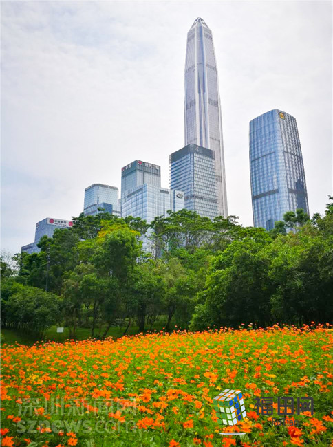 遠(yuǎn)處的平安大廈,近處的綠樹、花海,構(gòu)成了一副靜謐美好的畫面。