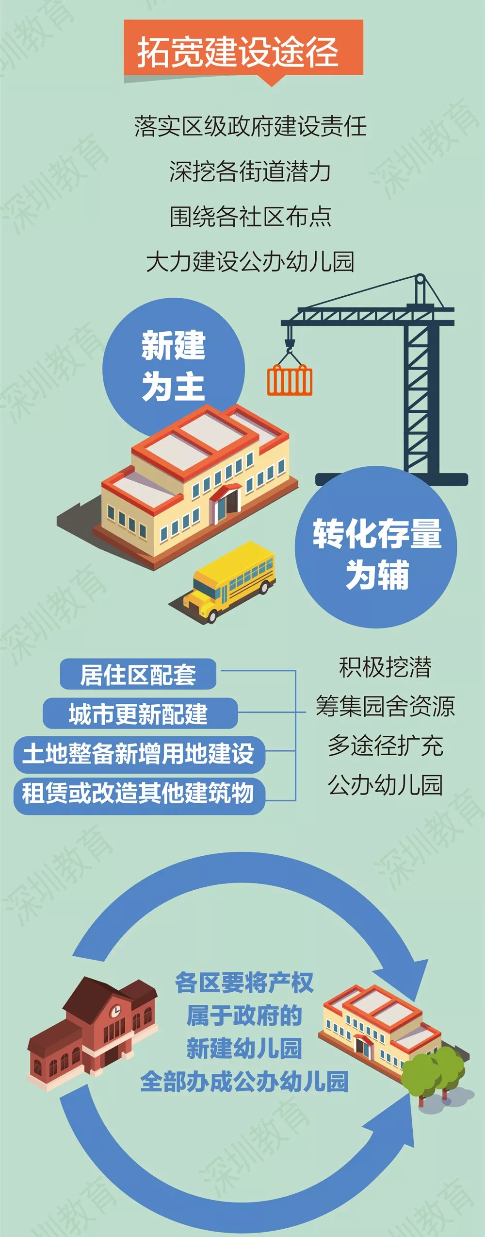 深圳公辦園建設(shè)策略將以市政府主導(dǎo)統(tǒng)籌推進(jìn)動(dòng),各區(qū)政府履行主體責(zé)任,挖掘各街道潛力,圍繞各社區(qū)布點(diǎn),力爭(zhēng)每個(gè)社區(qū)有1-2所公辦園,每年新建2萬個(gè)以上學(xué)前教育學(xué)位。加大幼兒園規(guī)劃與建設(shè)力度,鼓勵(lì)社會(huì)力量興辦幼兒園和其他類型學(xué)前教育機(jī)構(gòu)。