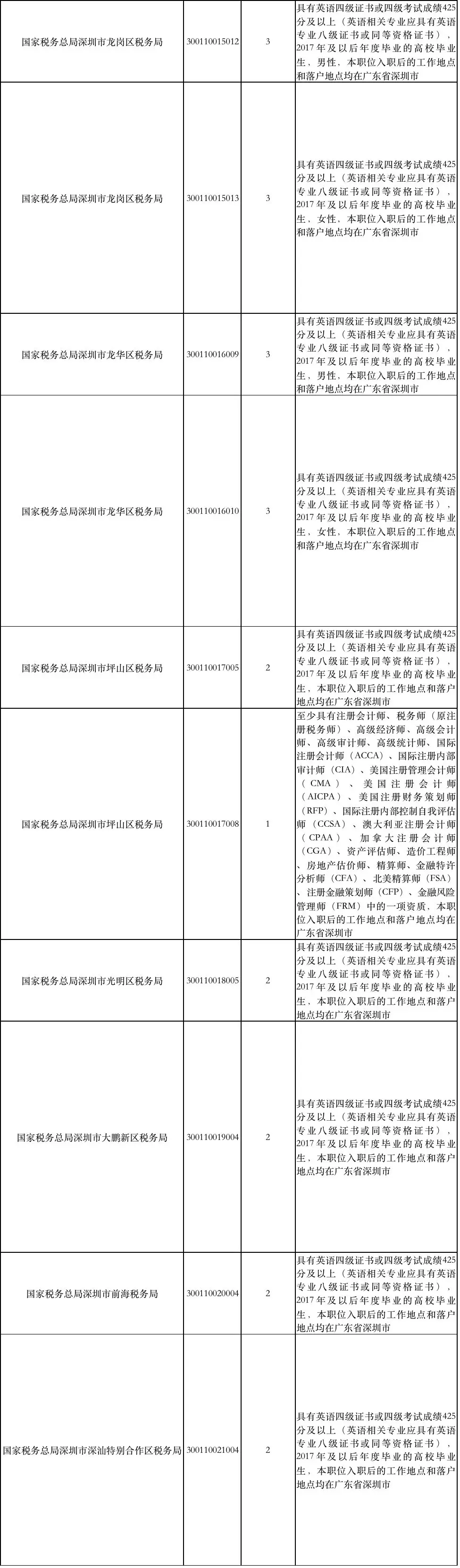 國家稅務(wù)總局深圳市稅務(wù)局補充錄用職位簡表: