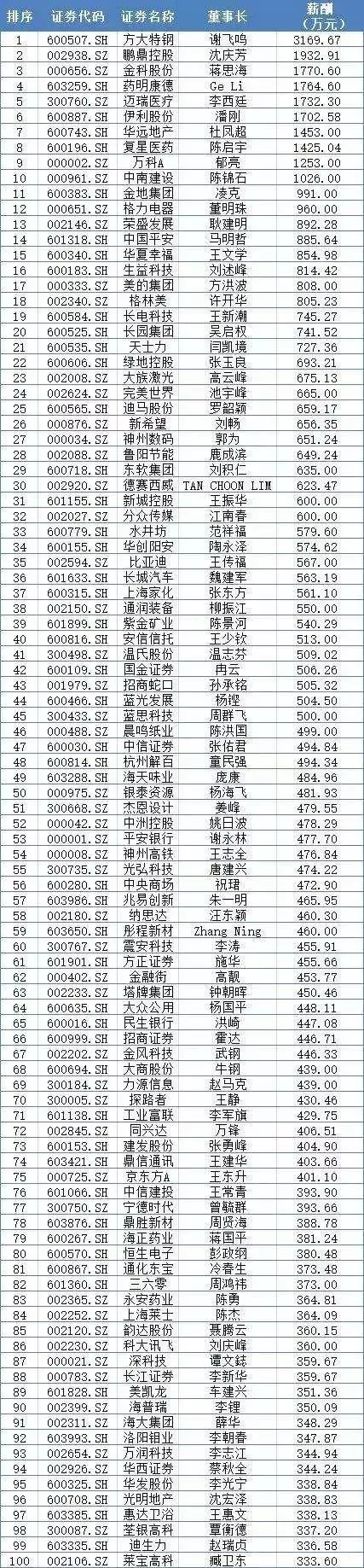 2018年A股上市公司董事長(zhǎng)年薪在500萬(wàn)以上的有44位,1000萬(wàn)以上的有10位。其中,2018年A股上市公司薪酬最高的為方大特鋼董事長(zhǎng)謝飛鳴,年薪為3169.67萬(wàn)元。萊寶高科董事長(zhǎng)以333.60正好躋身第100名。