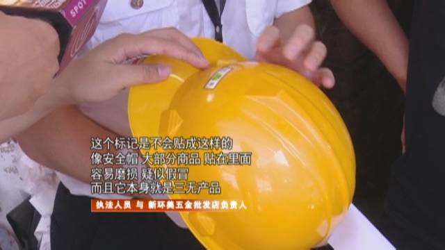 在新環(huán)美五金批發(fā)店,銷售的所有安全帽,除了寫有一個“安鑒”的字樣外,就再沒有任何標(biāo)識,而且“安鑒”標(biāo)志粘貼也不符合規(guī)范,明顯也屬于三無產(chǎn)品。